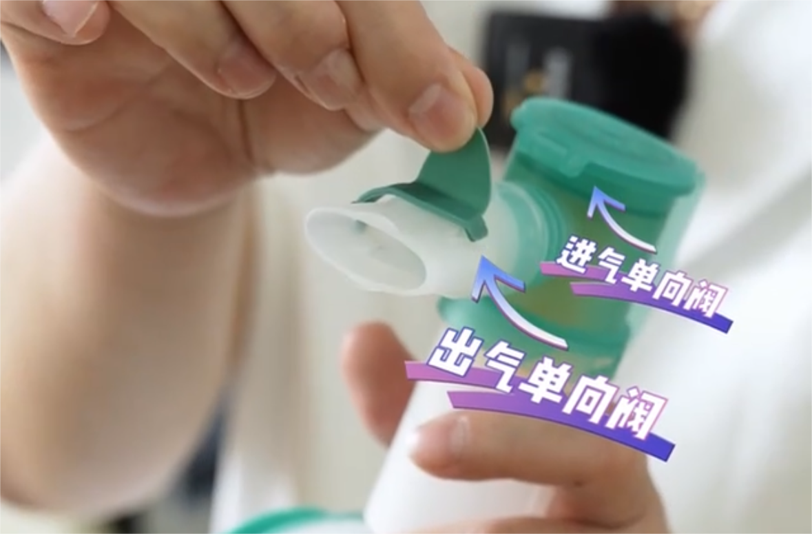 呼氣時(shí),呼氣單向閥打開,進(jìn)氣單向閥關(guān)閉,使呼氣周期的藥霧保留在儲(chǔ)霧腔里面;
