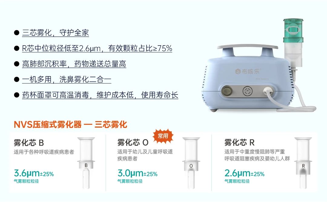 布咳樂(lè)NVS壓縮霧化器,可配合生理鹽水、霧化藥物進(jìn)行呼吸道疾病治療,配備3個(gè)霧化芯,R芯霧化中位粒徑可達(dá)到2.6微米,有效顆粒占比≥75%,高藥?kù)F肺部沉積,不浪費(fèi)藥液,有效達(dá)到用藥效果。